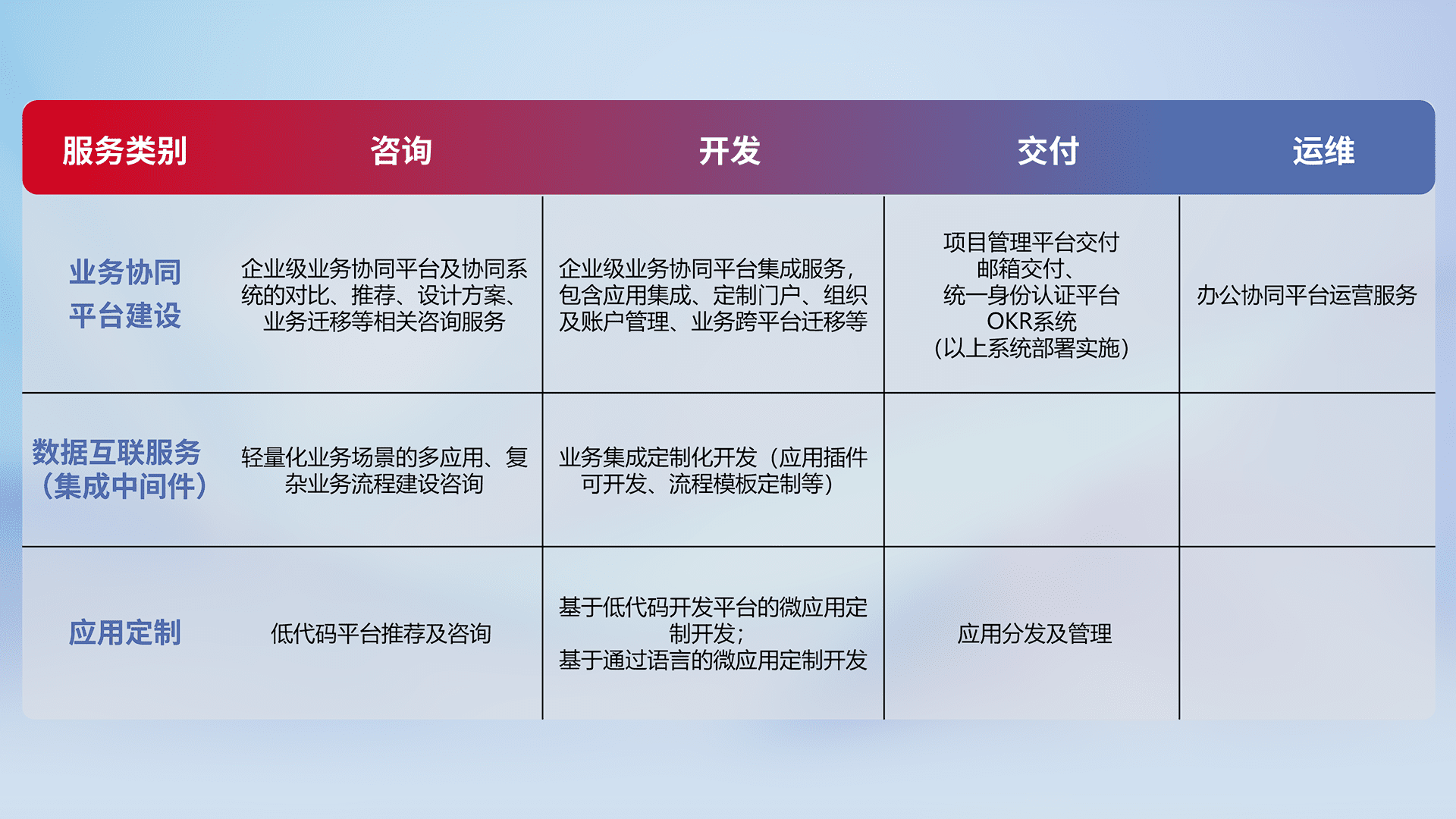 针对钉钉、、、企微、、、、IDaas等平台级产品提供产品的规划、、、方案、、、交付、、定制化开发等服务,,,,实现如统一协同办公、、智能客户服务、、、混合会议管理、、、、智能数据查询、、等业务场景,,,,实现数字化转型。。